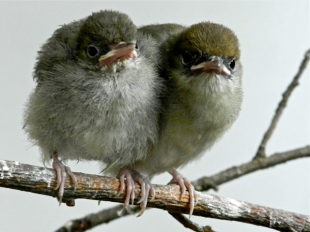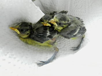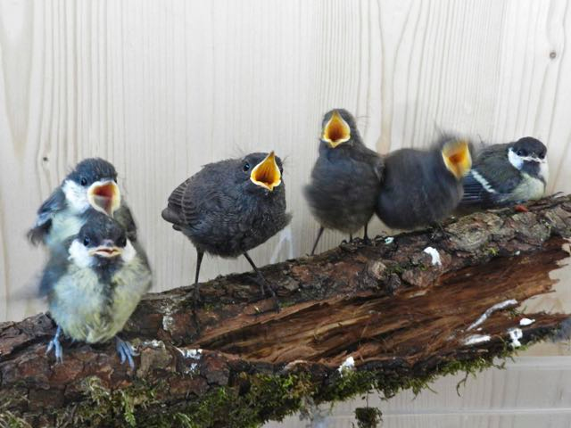 Auf diesen Bildern sehen Sie Nestlinge. Deutlich zu erkennen: sie sind noch nicht komplett befiedert, haben nackte Stellen. Sie liegen meist auf dem Bauch, wenn sie versuchen zu stehen, wackeln sie, stützen sich auf und fallen auch wieder um. Sie können noch nicht laufen / hüpfen und fallen auch runter, wenn man versucht, sie auf einen Ast zu setzen.