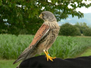 Nun war die Zeit gekommen, den zahmen Freund auszuwildern. Da er aus der Gegend stammte, wo ich arbeite und auch immer mit den Hunden die Mittagspause verbringe, wolle ich ihn, zur Wiedererkennung, markiert haben. Also erhielt er einen blauen Plastikring. Eines schönen Tages packte ich ihn, setzte ihn in die Katzenkiste und ab gings. Am Ort des Auswilderns wollte er nicht aus dem Kistchen. Erst als ich ihm den Arm hinhielt, kletterte er drauf, besah sich in aller Ruhe die Landschaft. Dann endlich flog er los, wie ein Pfeil. Er kreiste, schraubte sich hoch und verschwand dann....