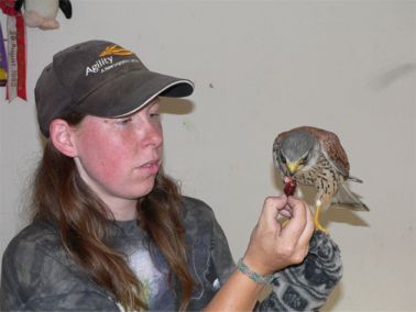 Es war ein adulter Terzel. Also, ein ausgewachsenes Männchen. Ich untersuchte ihn, fand aber keine Verletzungen, er wirkte nur etwas benommen, der Blick war aber klar. Da er neben der Strasse gefunden wurde, ging ich von einer Kollision mit einem Auto aus. Da ich einen strengen Terminplan hatte, beschloss ich, ihn zu mir nach Hause in die grosse Voliere zu nehmen, auf Möhlin (damals war ich noch Leiterin der Storchen- und Pflegestation Möhlin) schaffte ich es nun definitiv nicht. Dort angekommen setzte ich ihn ab und legte ihm eine Maus in den Käfig.